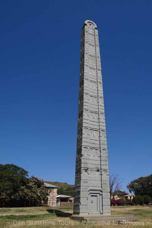 The three giant monolithic Stelae are carved to represent multistoried buildings with a pseudo-door, different types of windows and the so-called "monkey-heads" in Axumite's architectural style. The largest obelisk, which was 33 meters long and weighed about 500 tons, is the biggest piece of stone ever hewn out by men from the quarries of the ancient world.